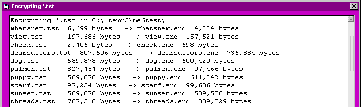 Cryptosystem ME6 incorporates a test to demonstrate its reliability experimentally by encrypting and decrypting any number of files with randomly generated keys and checking that the result of decryption is the same as what was encrypted.To perform the built-in reliability test first create a subfolder on a fixed disk (not a disk in drive A: or B:) called me6test (this can be a subfolder of a folder), then copy several files into it. You can use any number of files, of any size and type. Rename the files so that they all have extension .tst. (You can use the command rename *.* *.tst at a command line prompt).
