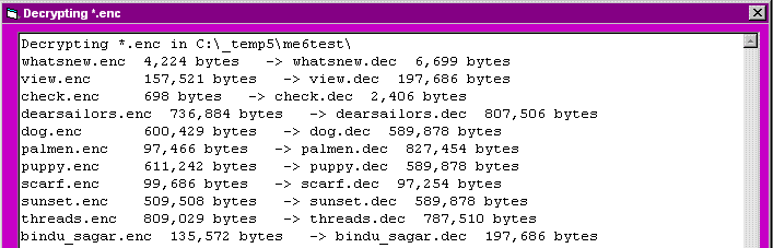If the file produced by decryption is not identical to the original plaintext file then ME6 immediately stops with an error message and displays the key being used.