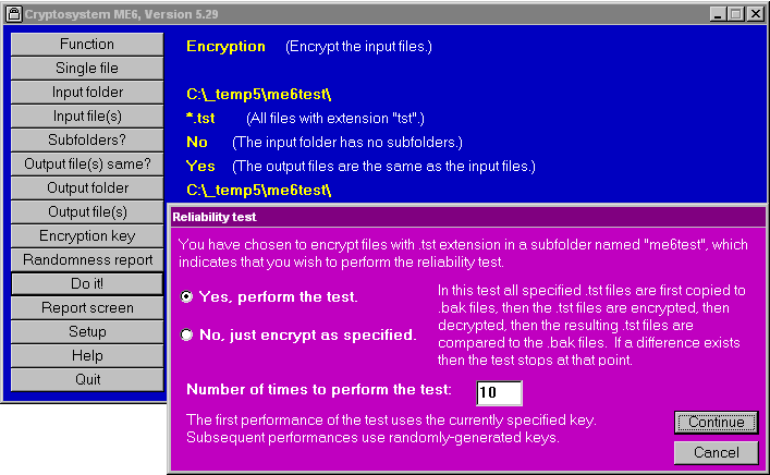 Specify the number of times to perform the test (1 through 999) then click on Continue. ME6 will then encrypt all the *.tst files in the me6test folder to *.enc files, then it will decrypt all those files to *.dec files, then it will compare the *.dec files to the *.tst files.