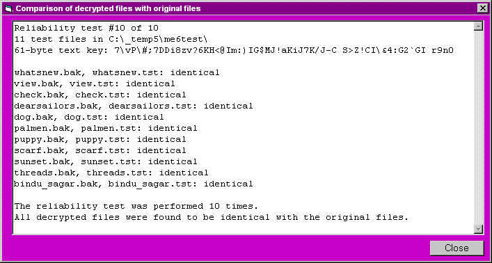 If a hundred files are copied into the me6test folder, and the reliability test is performed a hundred times, and all 10,000 encryptions and decryptions reproduce the original plaintext then this is evidence that ME6 will always recover the original plaintext when decrypting an encrypted file. Since the completion of ME6 the test has been run hundreds of thousands of times with no failure.