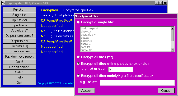 Specify the operation as encryption, specify the me6test folder as the input folder and specify the input files as *.tst.