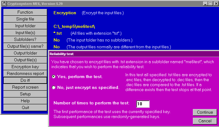 Specify the number of times to perform the test (1 through 999) then click on Continue. ME6 will then encrypt all the *.tst files in the me6test folder to *.enc files, then it will decrypt all those files to *.dec files, then it will compare the *.dec files to the *.tst files.