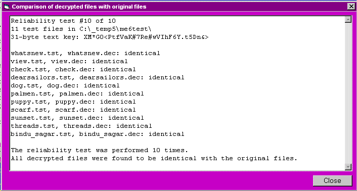 If the file produced by decryption is not identical to the original plaintext file then ME6 immediately stops with an error message and displays the key being used.