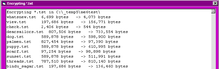 Cryptosystem ME6 incorporates a test to demonstrate its reliability experimentally by encrypting and decrypting any number of files with randomly generated keys and checking that the result of decryption is the same as what was encrypted.To perform the built-in reliability test first create a subfolder on a fixed disk (not a disk in drive A: or B:) called me6test (this can be a subfolder of a folder), then copy several files into it. You can use any number of files, of any size and type. Rename the files so that they all have extension .tst. (You can use the command rename *.* *.tst at a command line prompt).