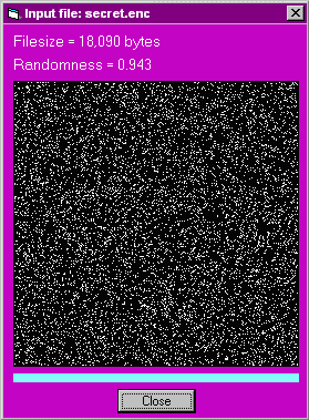 Since secret.enc is 18,090 bytes long, if it were composed of randomly generated bytes then we would expect an average byte-value frequency of 70.66 with, of course, some variation among the 256 byte values. The byte-value frequency in fact ranges smoothly from 48 to 96 (whose average is 72). As the graphic at right shows, the randomness as 0.943.