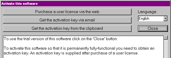 If, for now, you are mainly interested in seeing how the software looks and getting an idea of what it can do then you can just close this window (you can return to it via the 'Activate this software' button on the main screen).