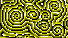 This cellular automaton provides an illustration of order emerging "spontaneously" from chaos. Starting from an array whose cells are in randomly assigned states, patterns eventually emerge. In other words, non-randomness emerges from randomness. This has significance for the question of whether complicated biological organisms can emerge from simpler ones as a result of chance occurrences (such as genetic mutations). Before drawing such a conclusion, however, we should note that in this cellular automaton pattern emerges from chaos only if the parameters governing the evolution of the system have values within a certain fairly narrow range. q = 200, k1 = 2, k2 = 3 and g = 70 produce spiral patterns, but spirals do not emerge for most other sets of values.