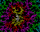 Here's an example of what the system looks like after running awhile, beginning with one seed cell, a concentration of 25% and using eight colors:
