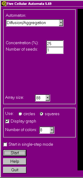 The initial screen for the Diffusion/Aggregation automaton has controls as shown at right: The rules for this automaton are given on the Algorithms page.